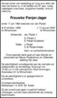 Jantina (Jaantje) Panjer, geb. te Oude Pekela op zaterdag 30 sep 1933 akte 134, ovl. (84 jaar oud) te Winschoten op maandag 29 jan 2018.- Vader: